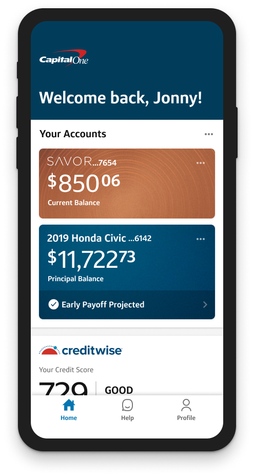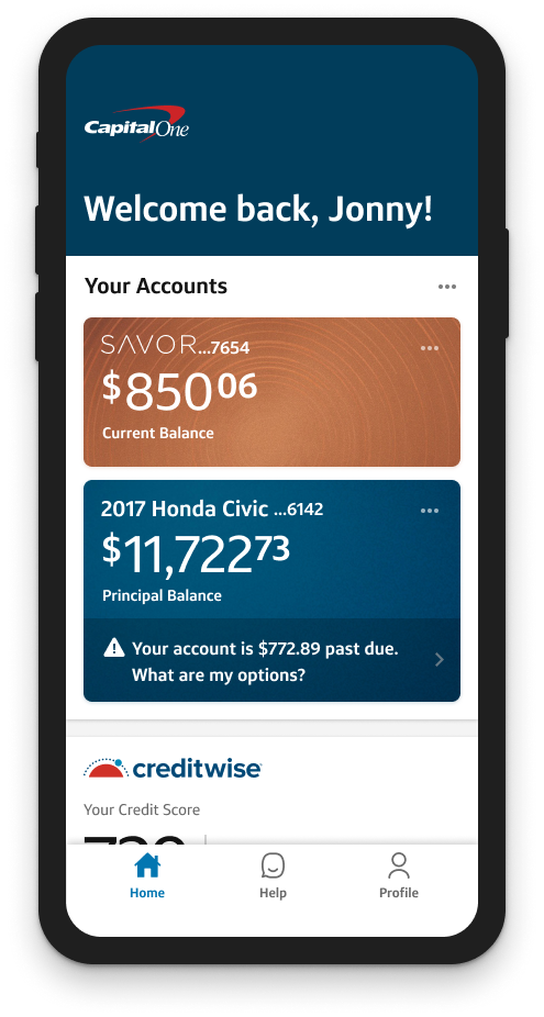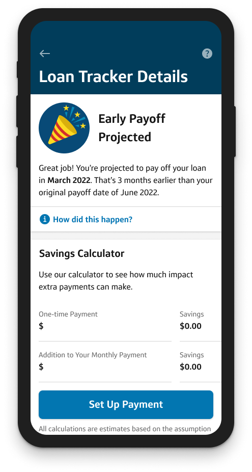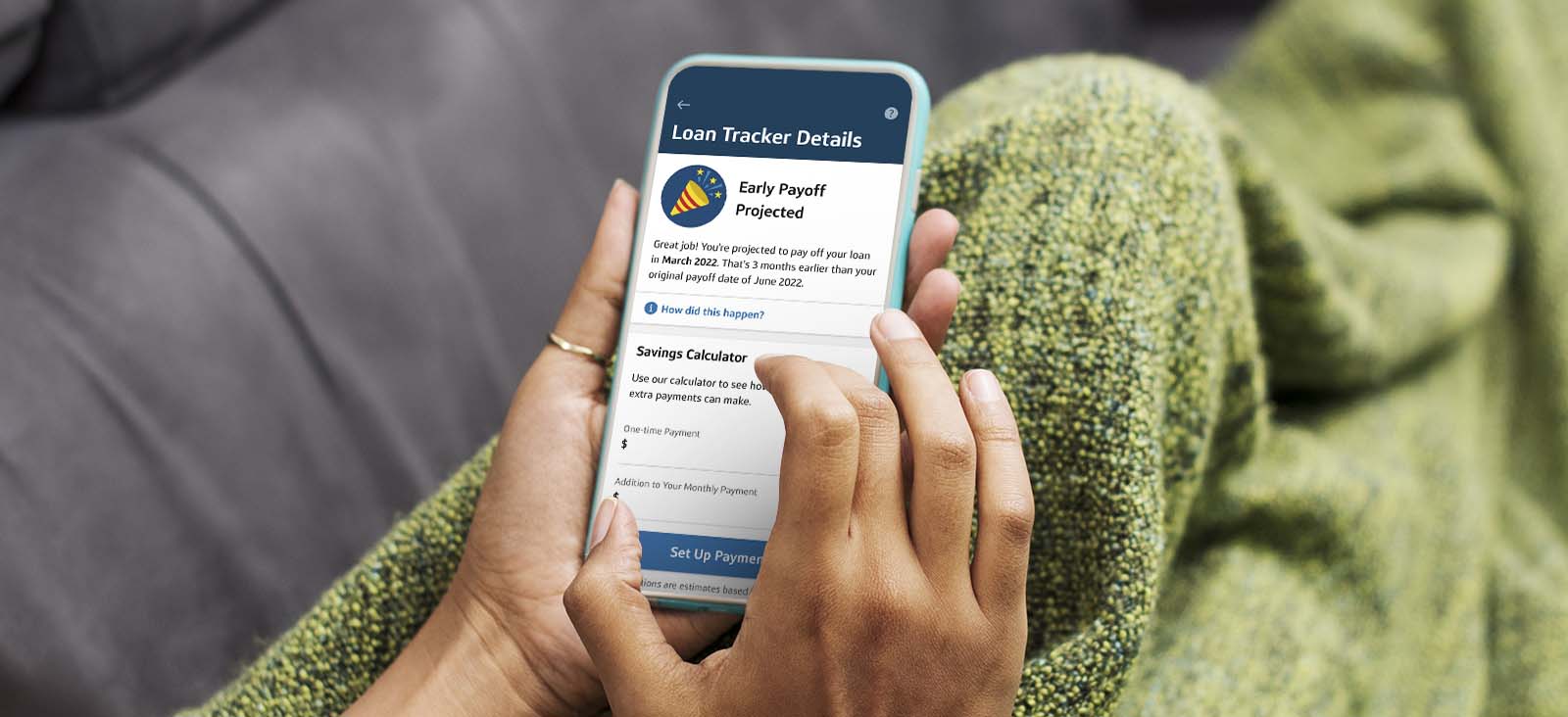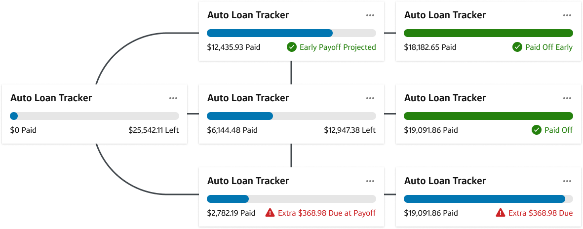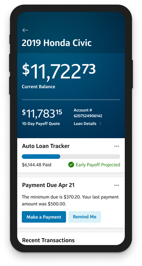 Homepage account tile design and account details view with Auto Loan Tracker feature.
