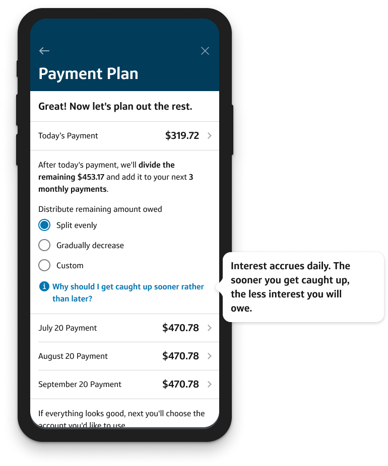 schedule with their payment plan. If they are behind, the tool shows them how much