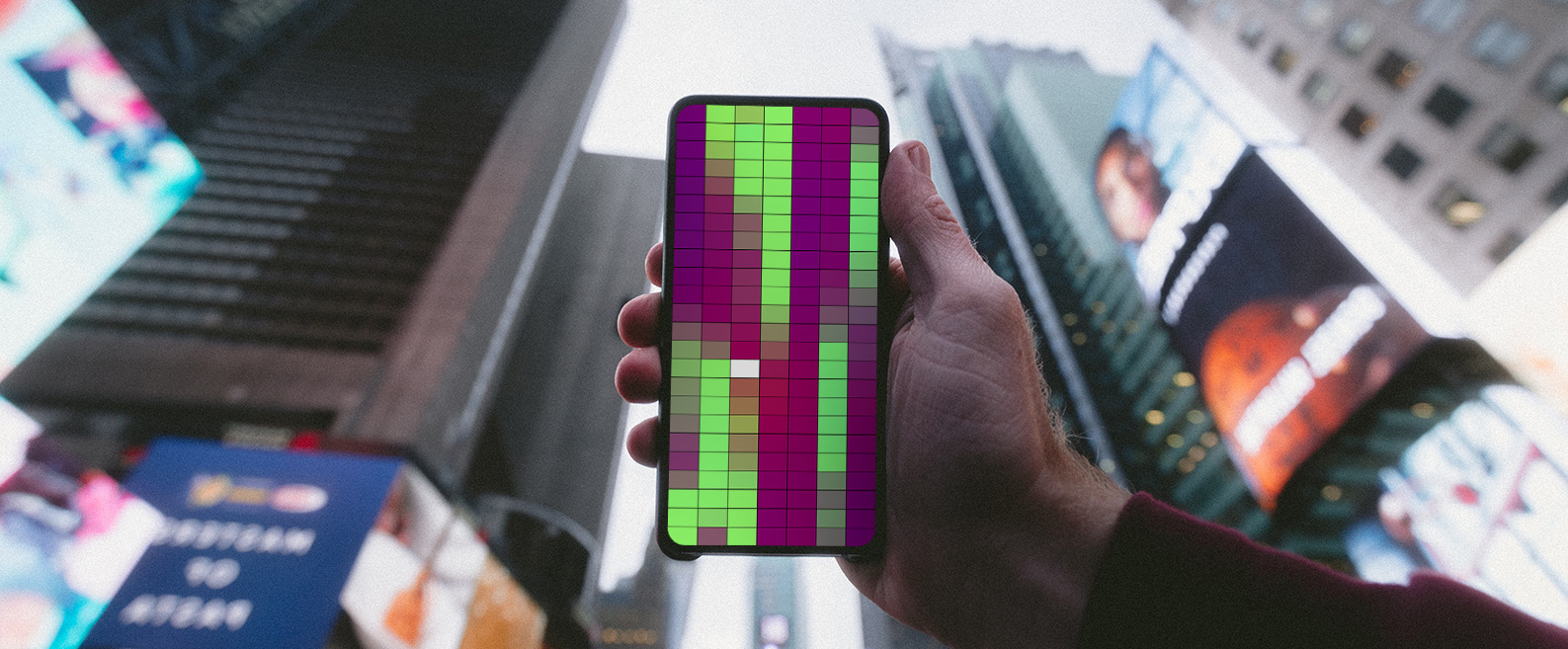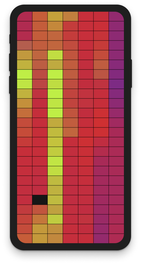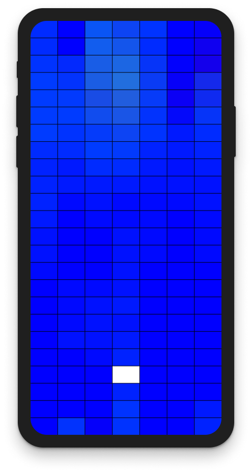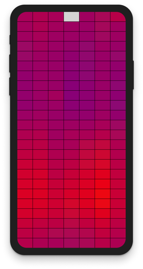 More reddish means a higher temperature while more blue indicates a cooler one. The more green a color is, the higher the chance of precipitation. You can identify the current hour on the grid by the fading animation from black to white.