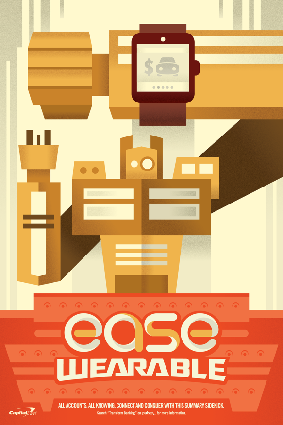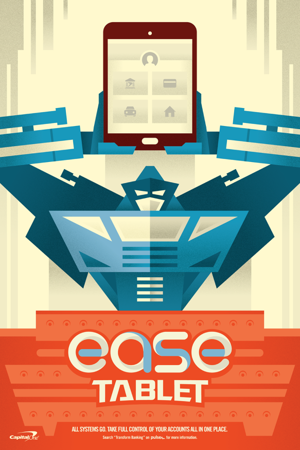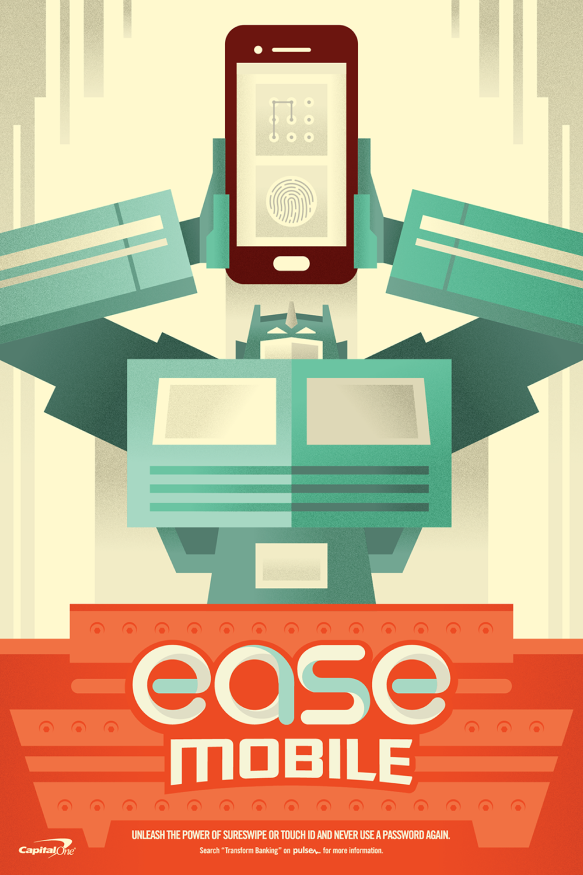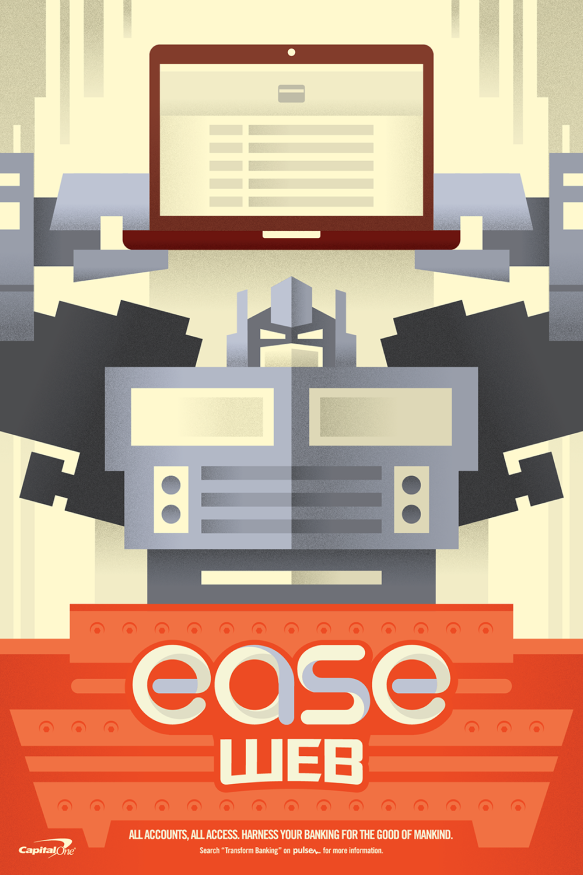 Concepted and designed a series of posters advertising the launch of the Enterprise Account Servicing Experience at the Capital One corporate offices across the US. The theme was intended to follow a larger tech “transformation” initiative happening within the company.